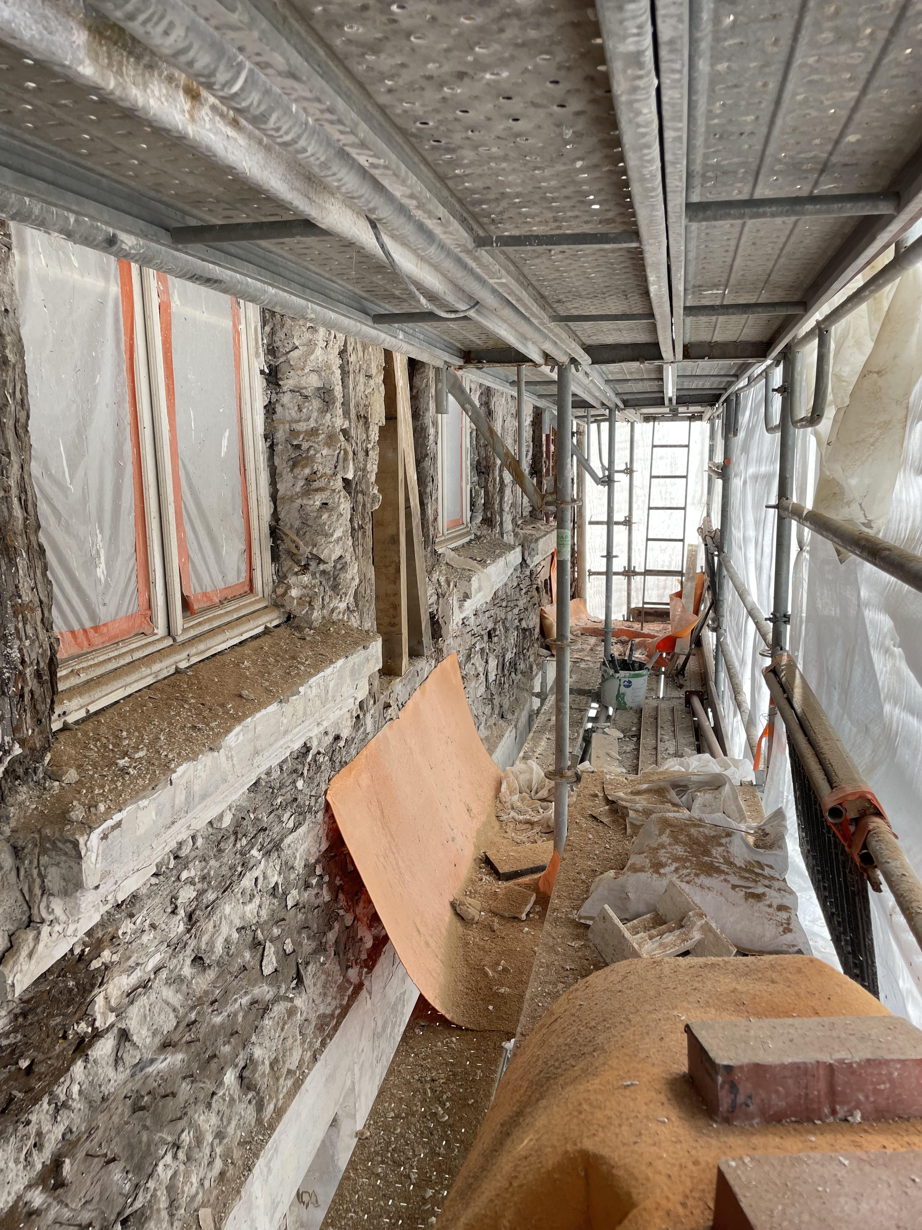 Maçonnerie en recherche et application d’un enduit mince à la chaux (544m²),